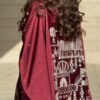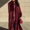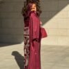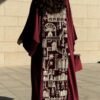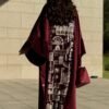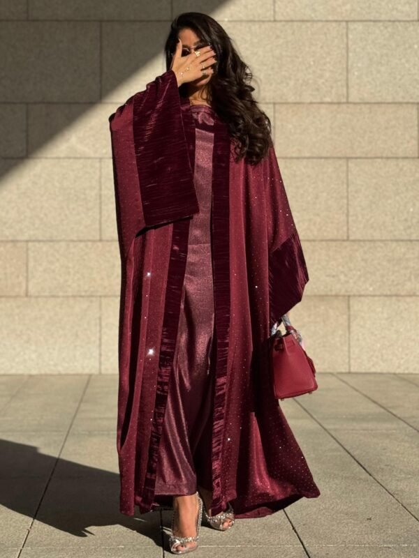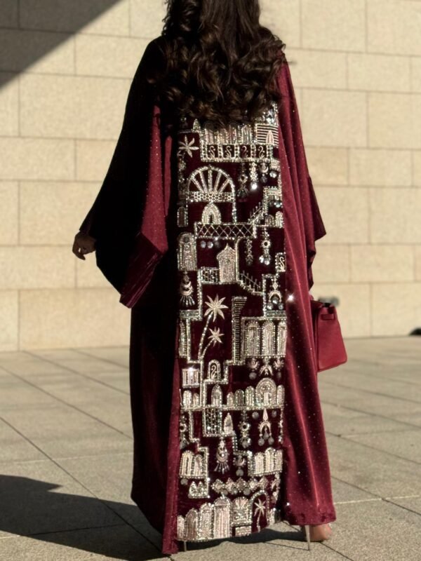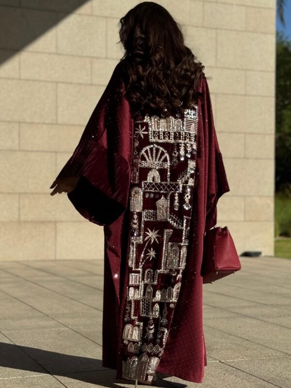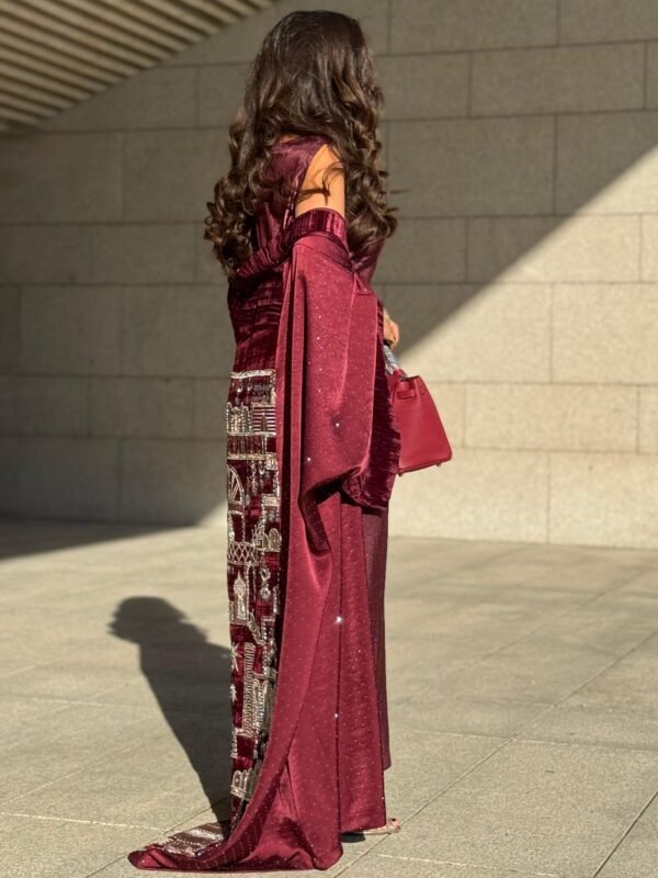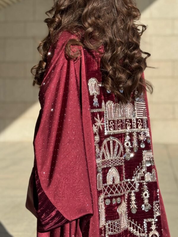 The fabric is silk crepe embroidered and embellished with crystal and velvet